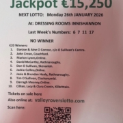 The next draw will take place on Monday, January 26th when the jackpot will be an incredible €15,250!  Many thanks for supporting Valley Rovers GAA by playing the lotto weekly on: https:/valleyroversgaa.clubzap.com/categories/lotto/products