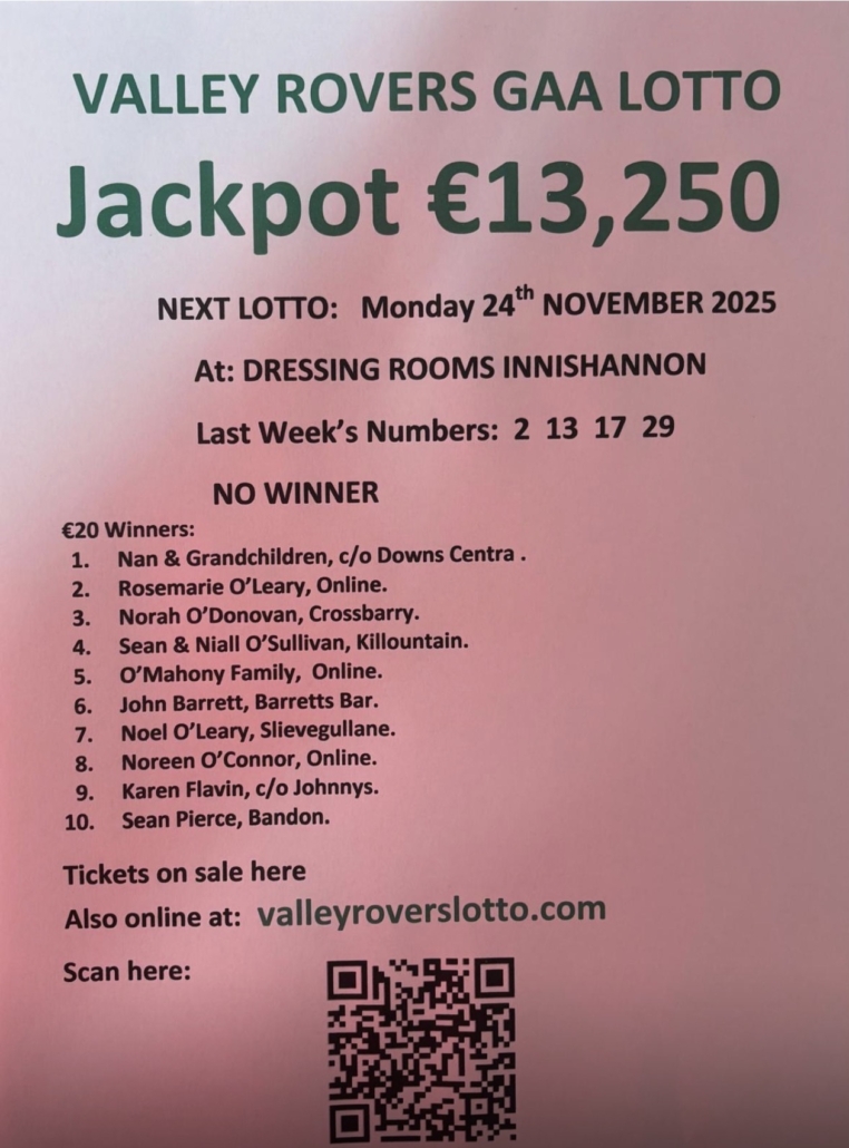 Next draw will take place on Monday, November 24th when the jackpot will be an amazing €13,250!  Many thanks for supporting Valley Rovers GAA by playing the lotto weekly on: https:/valleyroversgaa.clubzap.com/categories/lotto/products