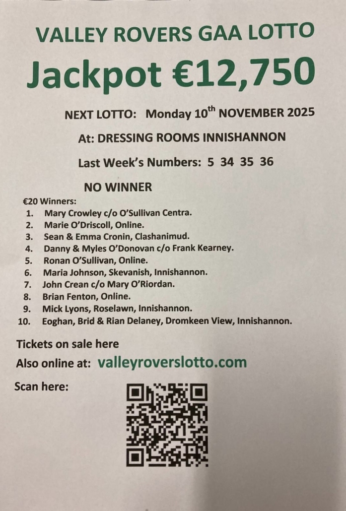 Next draw will take place on Monday, November 10th when the jackpot will be an amazing €12,750! Many thanks for supporting Valley Rovers GAA by playing the lotto weekly on: https:/valleyroversgaa.clubzap.com/categories/lotto/products
