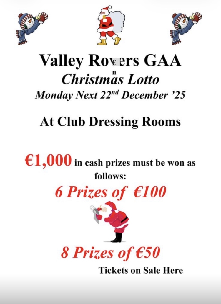 Valley Rovers GAA Christmas Lotto Draw – December 22nd!